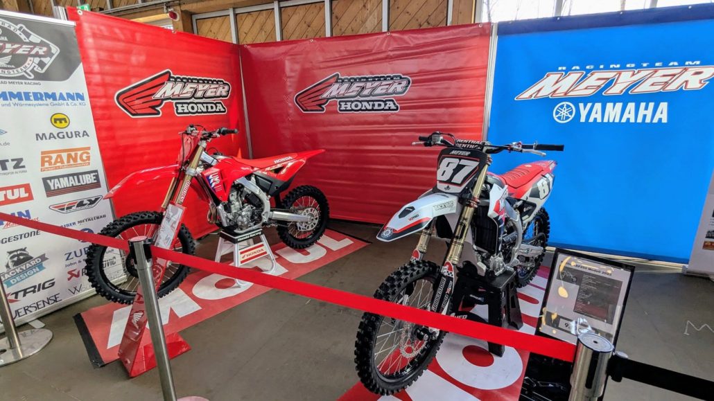 Zwei ausgestellte rote Motocross-Motorräder, eine Honda und eine Yamaha, mit "Meyer Racing Team" Bannern im Hintergrund.