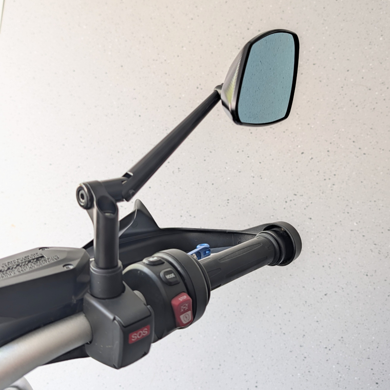 Das robusten Kugelgelenke an der Rückseite der Gehäuse gleitet stramm, aber geschmeidig. Dank dieser Kugelgelenke lässt sich die Position extrem fein justieren. Ich setze mich in meine gewohnte Fahrposition auf das Motorrad, umgreife den Lenker und richte meinen Blick nach vorn, greife nach den Spiegelgehäusen und justiere die Winkel. Ich bewege die Spiegel millimetergenau, bis die asymmetrische Form der Gehäuse die Linie der Handprotektoren perfekt aufgreift und ich den optimalen Blick nach hinten habe. Jetzt haben die Spiegel unwiderruflich ihre perfekte Position.